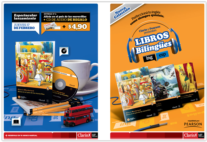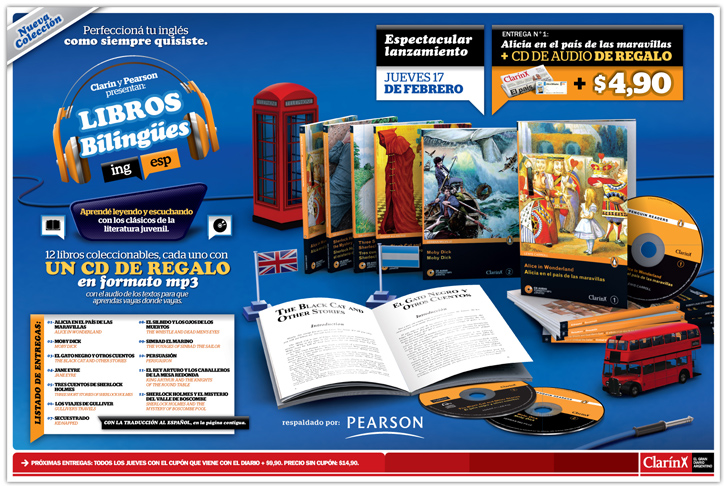 Campaña 360º para el lanzamiento del coleccionable Libros Bilingües Pearson, opcional de diario Clarín.
